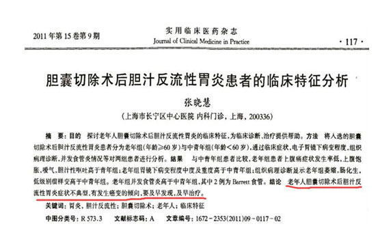 《實用臨床醫(yī)藥雜志》曾寫到:老年人切膽后易形成膽汁反流性胃炎,而60%的膽汁反流性胃炎患者會經一系列病變使胃癌和食管腺癌的幾率增高